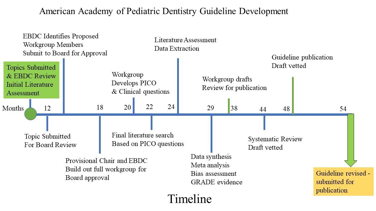 The AAPD regularly develops, publishes, and disseminates clinical practice guidelines via the process described in this section. The topic for each clinical practice guideline is recommended by the Evidence-Based Dentistry Committee and approved by the Board of Trustees. Potential topics for consideration by the EBD committee for systematic reviews and or guideline development can be submitted by EBD Committee members, AAPD leaders and members, and council/committee members. The EBD committee may also consider topics of high priority to pediatric dentistry. Topics are then evaluated by literature review to determine if there is adequate published material that could inform development of a review and guideline. If the topic is deemed of sufficient importance and there is adequate published material to inform a guideline, then the topic and a proposal is submitted to the AAPD Board of Trustees as described above.